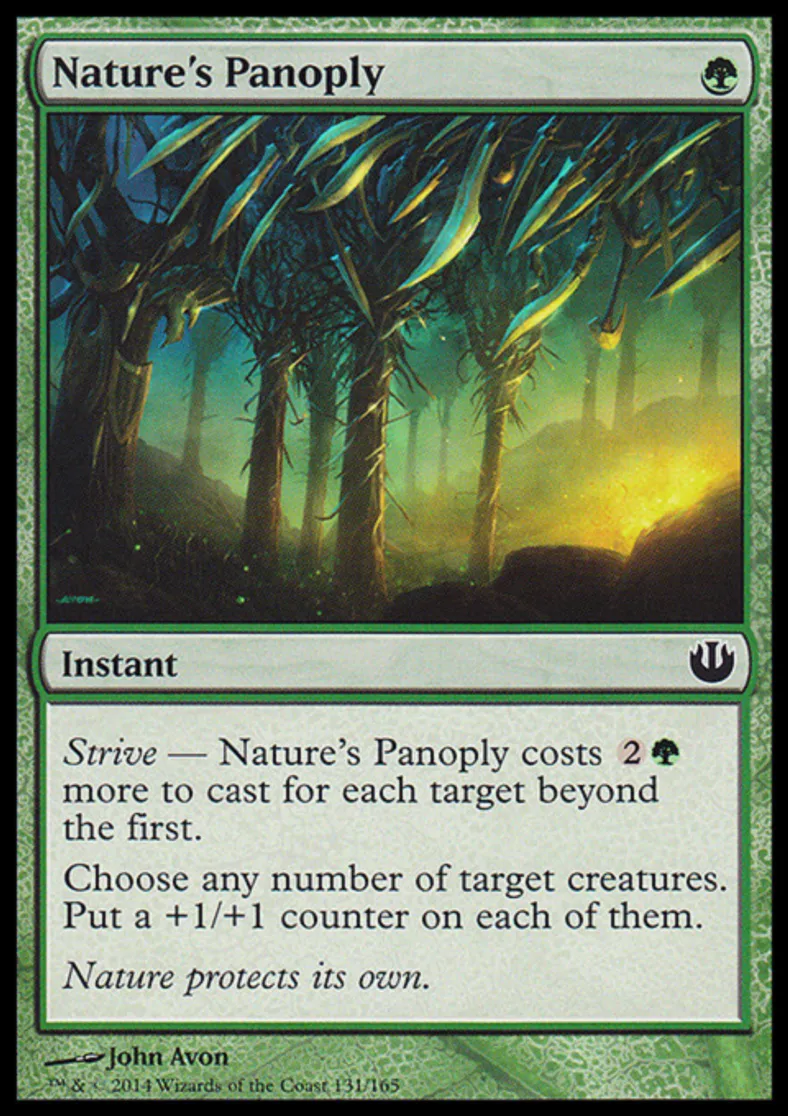 | Oracle Text | Strive — Nature's Panoply costs {{2}}{{g}} more to cast for each target beyond the first. Choose any number of target creatures. Put a +1/+1 counter on each of them. | ||