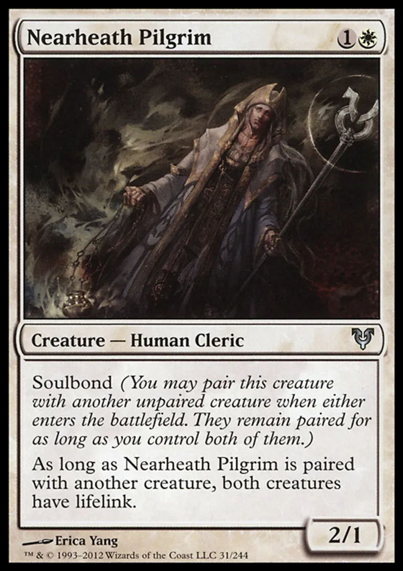 | Oracle Text | Soulbond (You may pair this creature with another unpaired creature when either enters the battlefield. They remain paired for as long as you control both of them.) As long as Nearheath Pilgrim is paired with another creature, both creatures have lifelink. | ||
