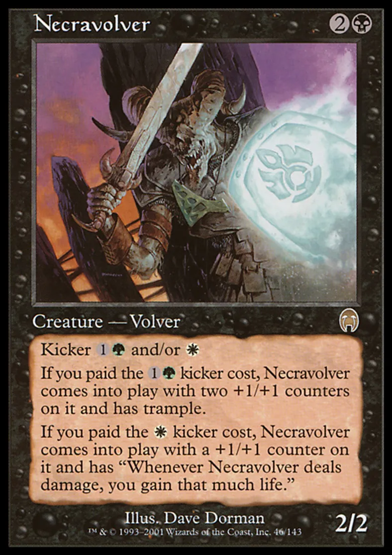 | Oracle Text | Kicker {{1}}{{g}} and/or {{w}} (You may pay an additional {{1}}{{g}} and/or {{w}} as you cast this spell.) If Necravolver was kicked with its {{1}}{{g}} kicker, it enters the battlefield with two +1/+1 counters on it and with trample. If Necravolver was kicked with its {{w}} kicker, it enters the battlefield with a +1/+1 counter on it and with "Whenever Necravolver deals damage, you gain that much life." | ||
