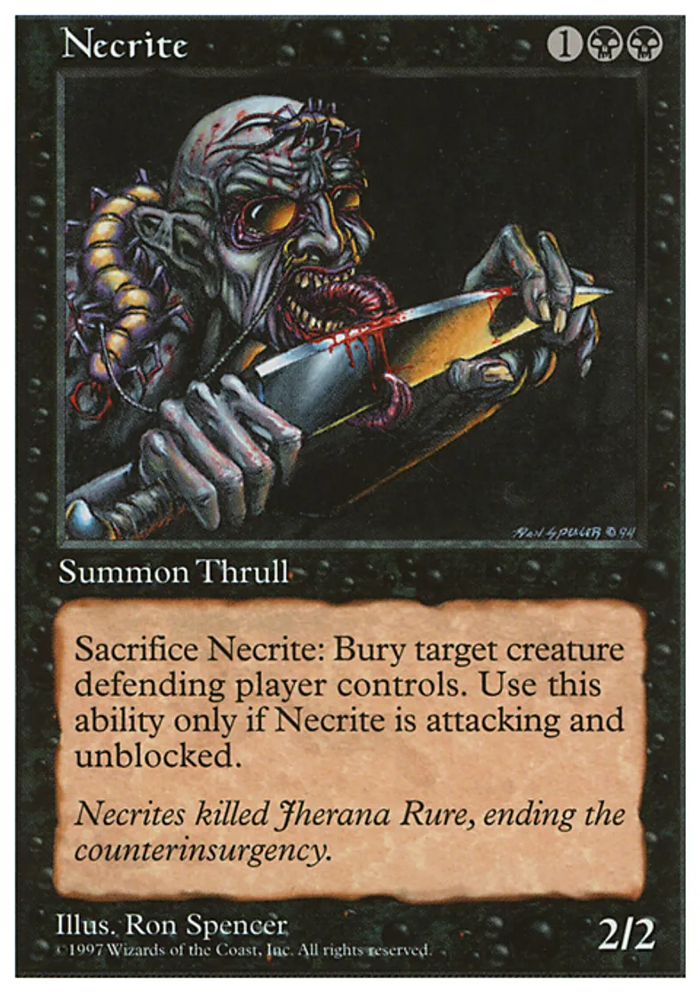 | Oracle Text | Whenever Necrite attacks and isn't blocked, you may sacrifice it. If you do, destroy target creature defending player controls. It can't be regenerated. | ||