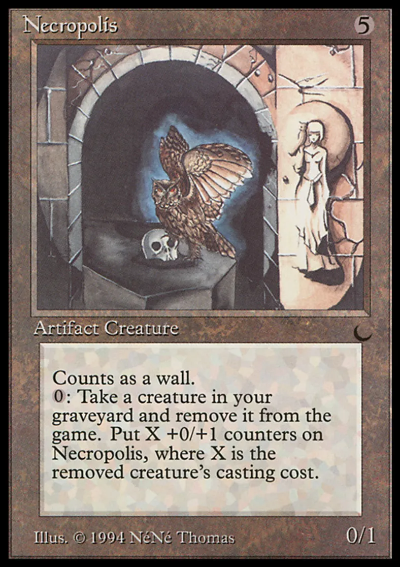| Oracle Text | Defender (This creature can't attack.) Exile a creature card from your graveyard: Put X +0/+1 counters on Necropolis, where X is the exiled card's converted mana cost. | ||