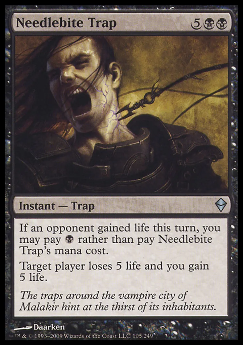 | Oracle Text | If an opponent gained life this turn, you may pay {{b}} rather than pay Needlebite Trap's mana cost. Target player loses 5 life and you gain 5 life. | ||