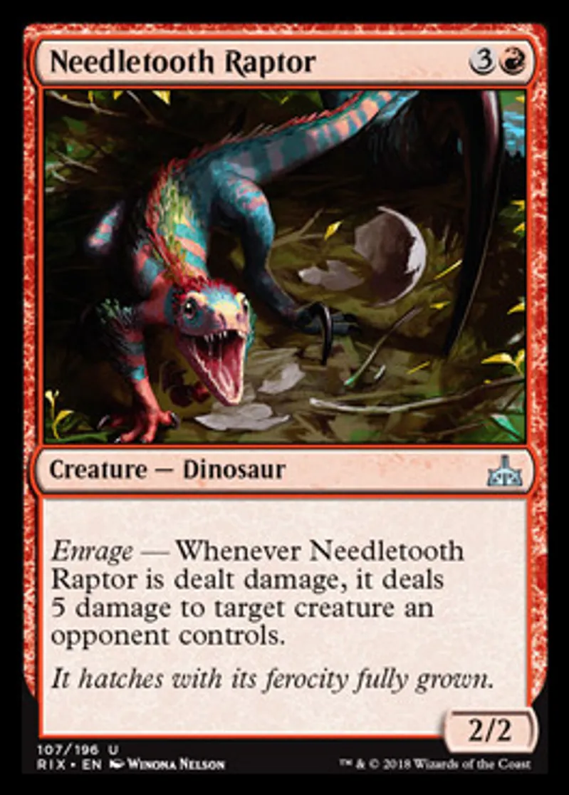 | Oracle Text | Enrage — Whenever Needletooth Raptor is dealt damage, it deals 5 damage to target creature an opponent controls. | ||