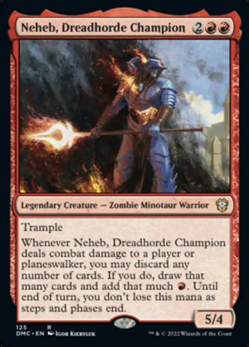 Magic: the Gathering (mtg) rare Legendary Creature — Zombie Minotaur Warrior Neheb, Dreadhorde Champion from Dominaria United Commander (dmc) last updated 2026-02-25 15:39:02