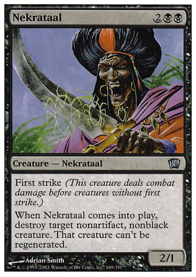 | Oracle Text | First strike (This creature deals combat damage before creatures without first strike.) When Nekrataal enters the battlefield, destroy target nonartifact, nonblack creature. That creature can't be regenerated. | ||