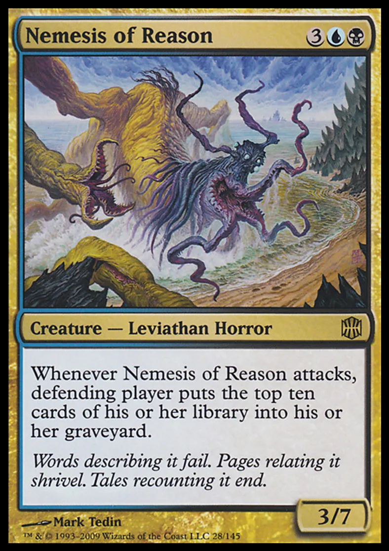 | Oracle Text | Whenever Nemesis of Reason attacks, defending player puts the top ten cards of his or her library into his or her graveyard. | ||