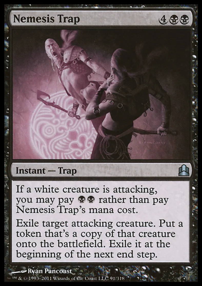 | Oracle Text | If a white creature is attacking, you may pay {{b}}{{b}} rather than pay Nemesis Trap's mana cost. Exile target attacking creature. Put a token that's a copy of that creature onto the battlefield. Exile it at the beginning of the next end step. | ||