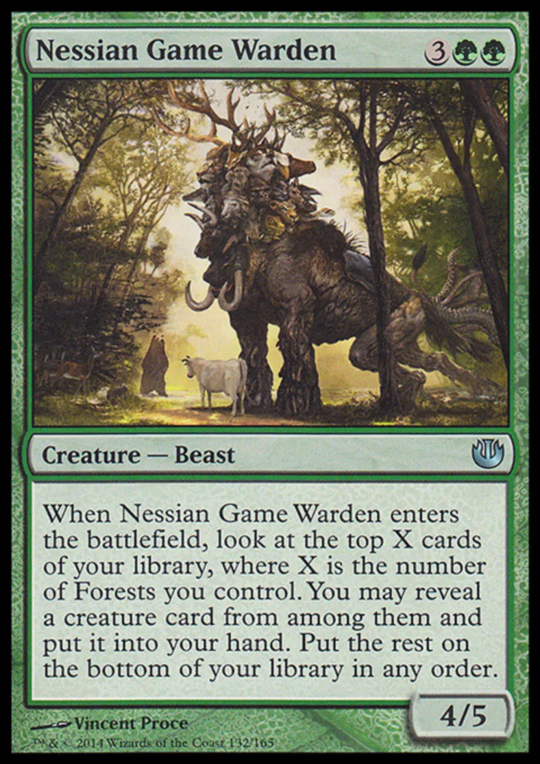 | Oracle Text | When Nessian Game Warden enters the battlefield, look at the top X cards of your library, where X is the number of Forests you control. You may reveal a creature card from among them and put it into your hand. Put the rest on the bottom of your library in any order. | ||