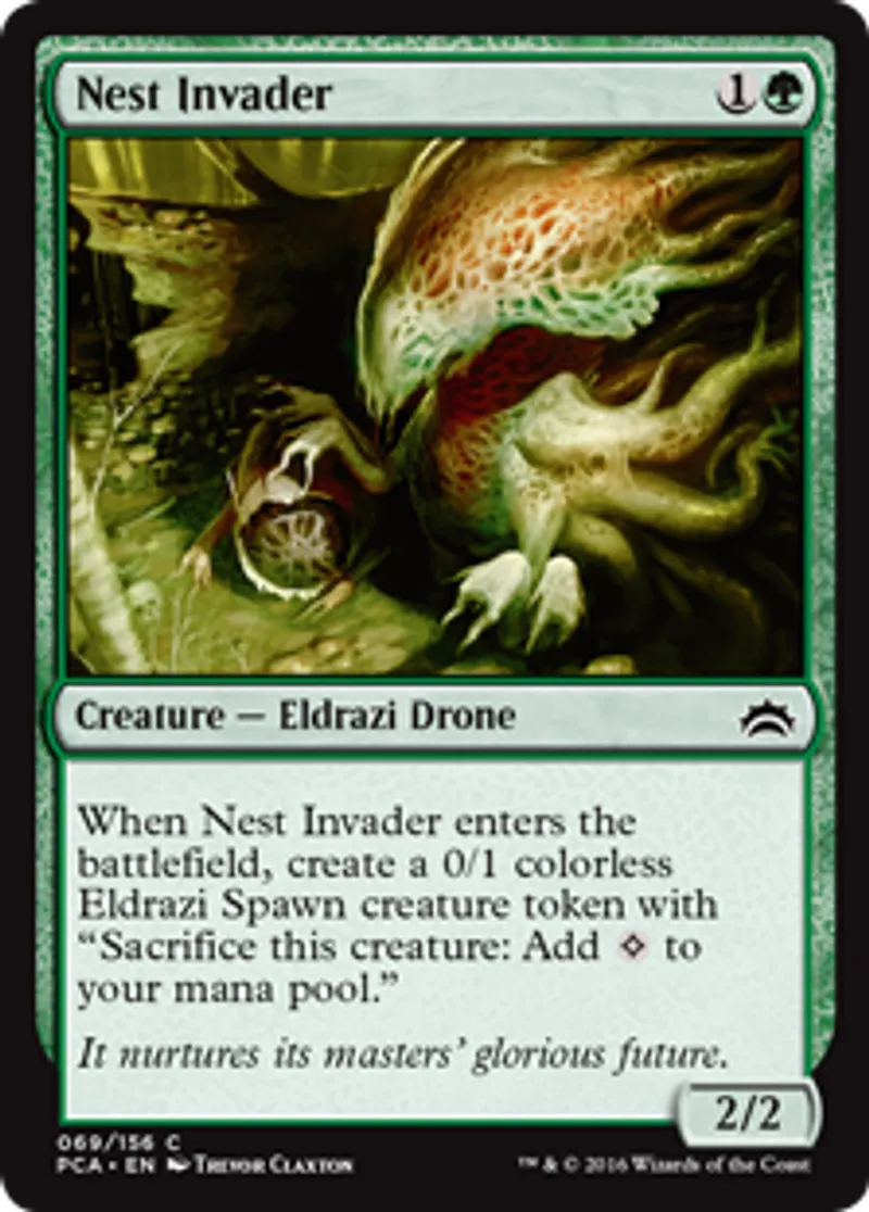 | Oracle Text | When Nest Invader enters the battlefield, create a 0/1 colorless Eldrazi Spawn creature token. It has "Sacrifice this creature: Add {{Colorless}} to your mana pool." | ||