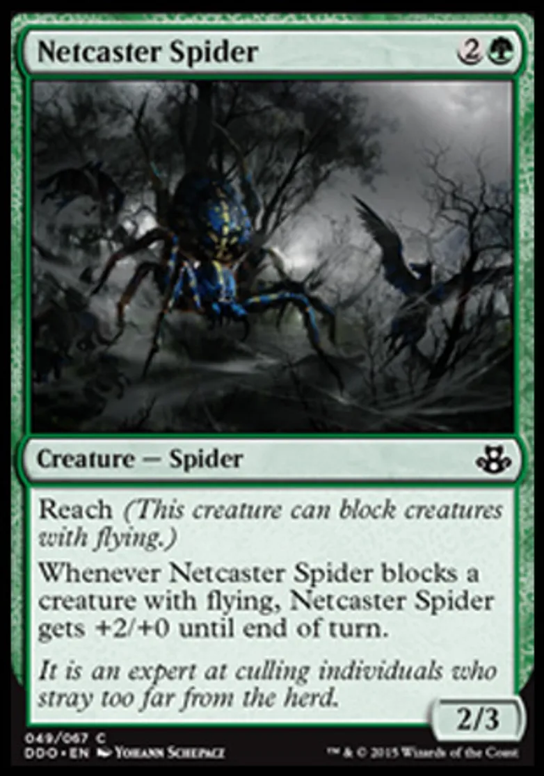 | Oracle Text | Reach (This creature can block creatures with flying.) Whenever Netcaster Spider blocks a creature with flying, Netcaster Spider gets +2/+0 until end of turn. | ||