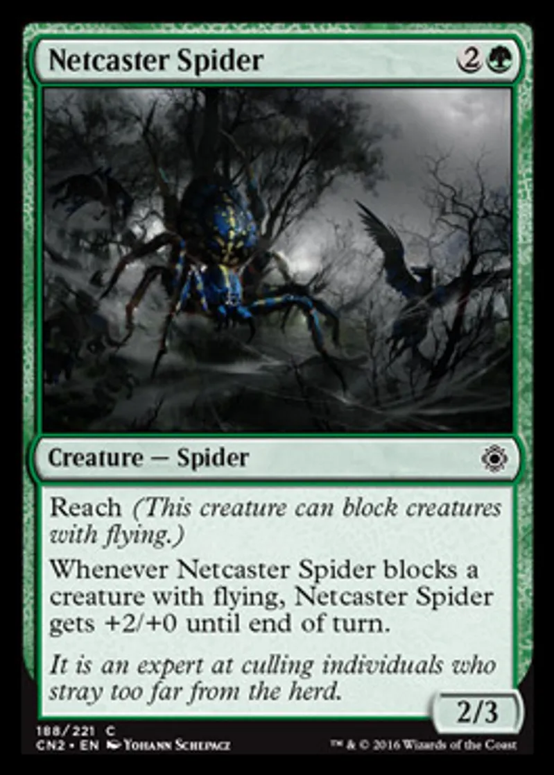 | Oracle Text | Reach (This creature can block creatures with flying.) Whenever Netcaster Spider blocks a creature with flying, Netcaster Spider gets +2/+0 until end of turn. | ||