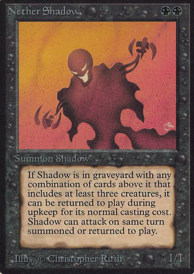| Oracle Text | Haste At the beginning of your upkeep, if Nether Shadow is in your graveyard with three or more creature cards above it, you may put Nether Shadow onto the battlefield. | ||