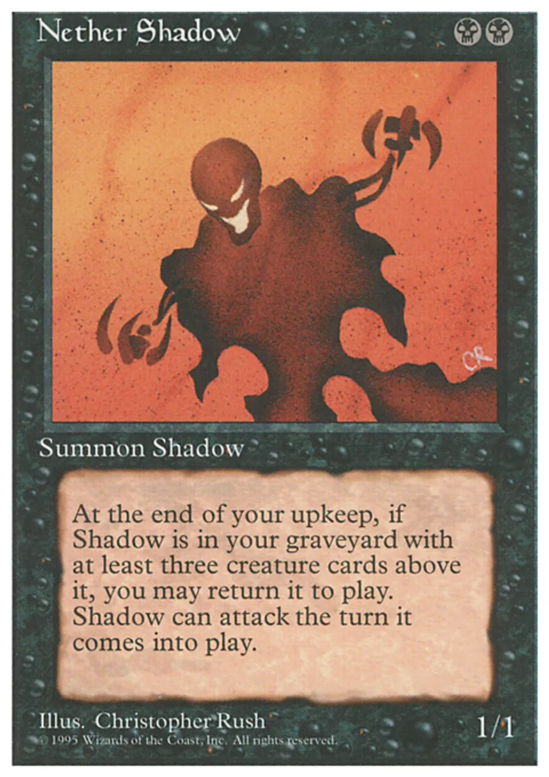 | Oracle Text | Haste At the beginning of your upkeep, if Nether Shadow is in your graveyard with three or more creature cards above it, you may put Nether Shadow onto the battlefield. | ||