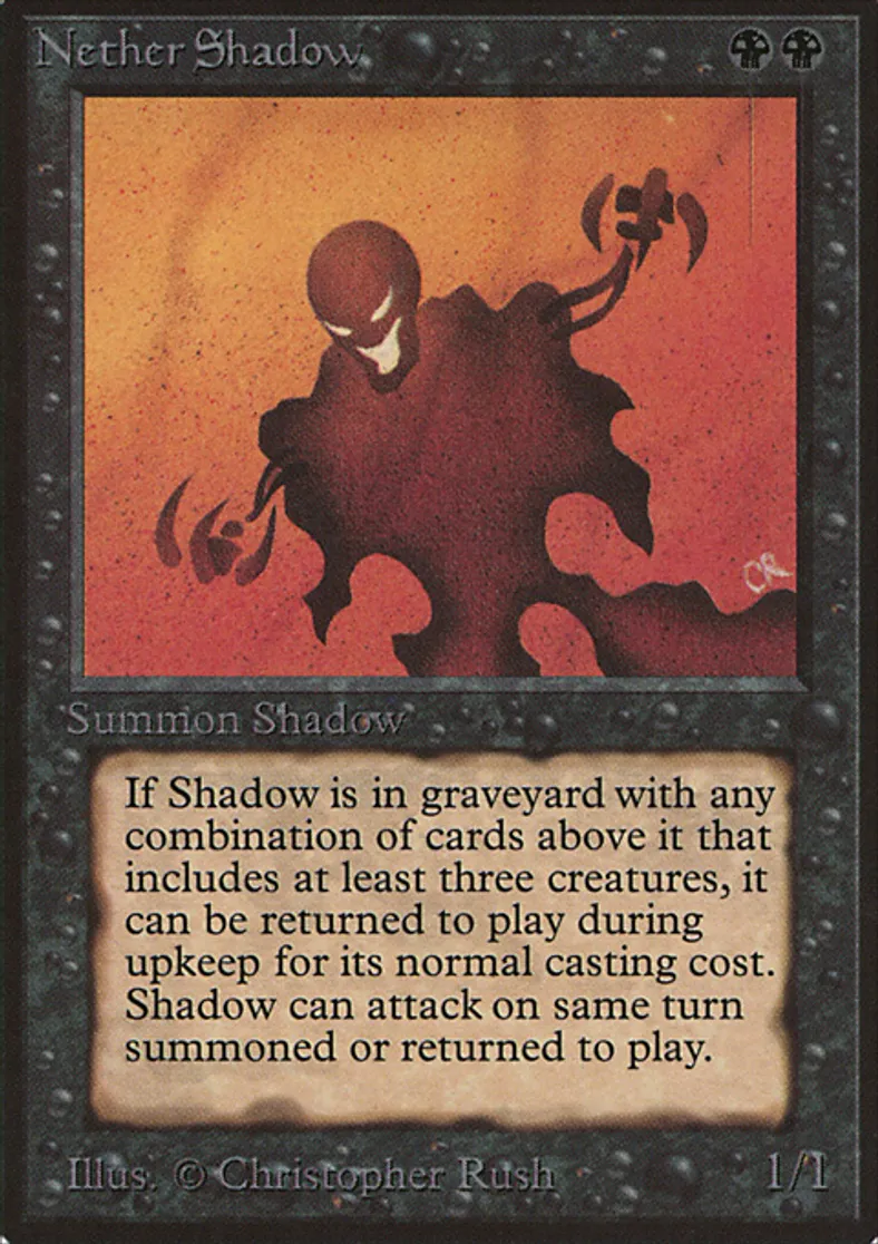 | Oracle Text | Haste At the beginning of your upkeep, if Nether Shadow is in your graveyard with three or more creature cards above it, you may put Nether Shadow onto the battlefield. | ||