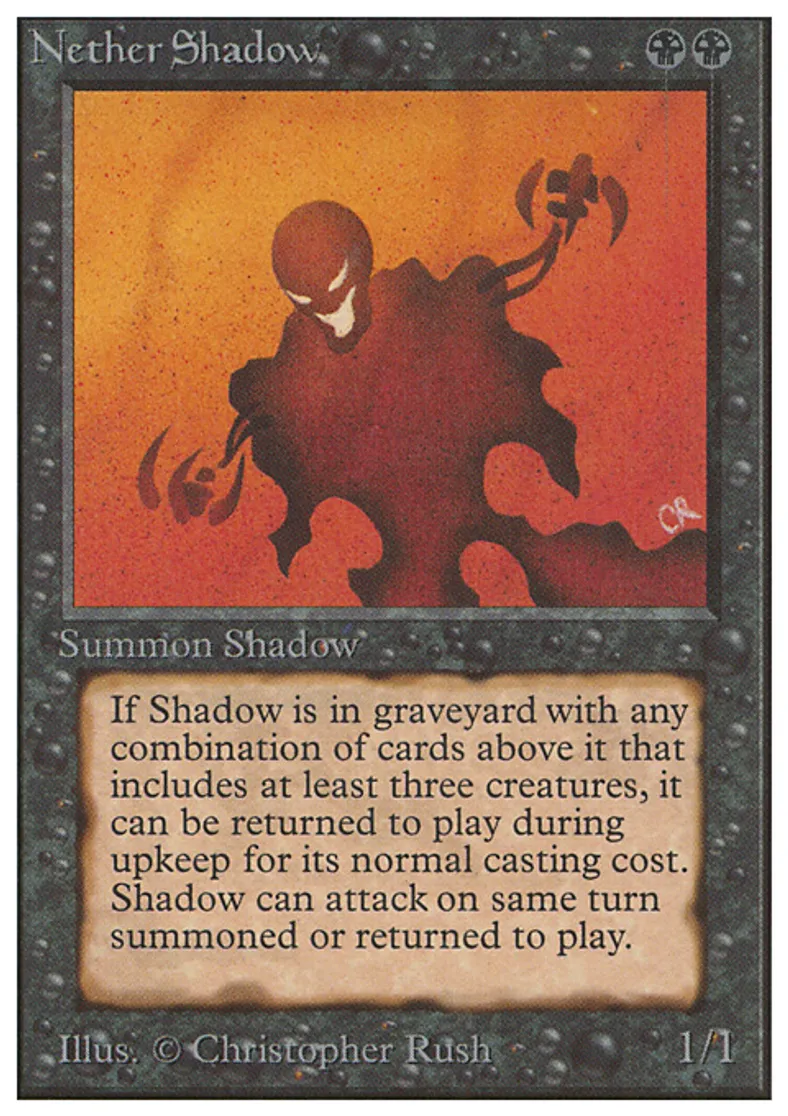 | Oracle Text | Haste At the beginning of your upkeep, if Nether Shadow is in your graveyard with three or more creature cards above it, you may put Nether Shadow onto the battlefield. | ||