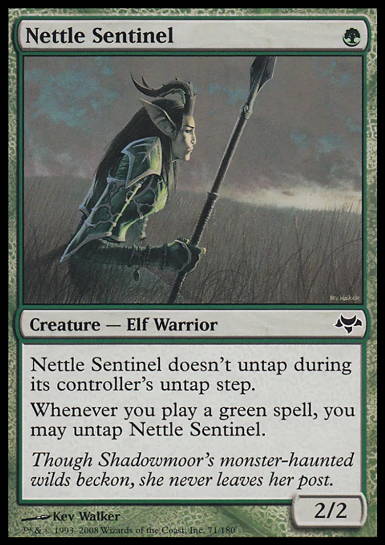 | Oracle Text | Nettle Sentinel doesn't untap during your untap step. Whenever you cast a green spell, you may untap Nettle Sentinel. | ||