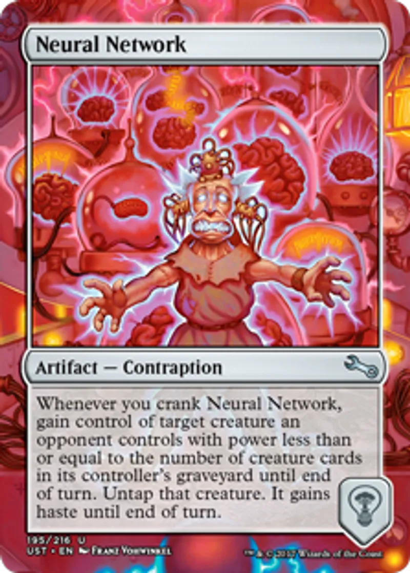 | Oracle Text | Whenever you crank Neural Network, gain control of target creature an opponent controls with power less than or equal to the number of creature cards in its controller's graveyard until end of turn. Untap that creature. It gains haste until end of turn. | ||
