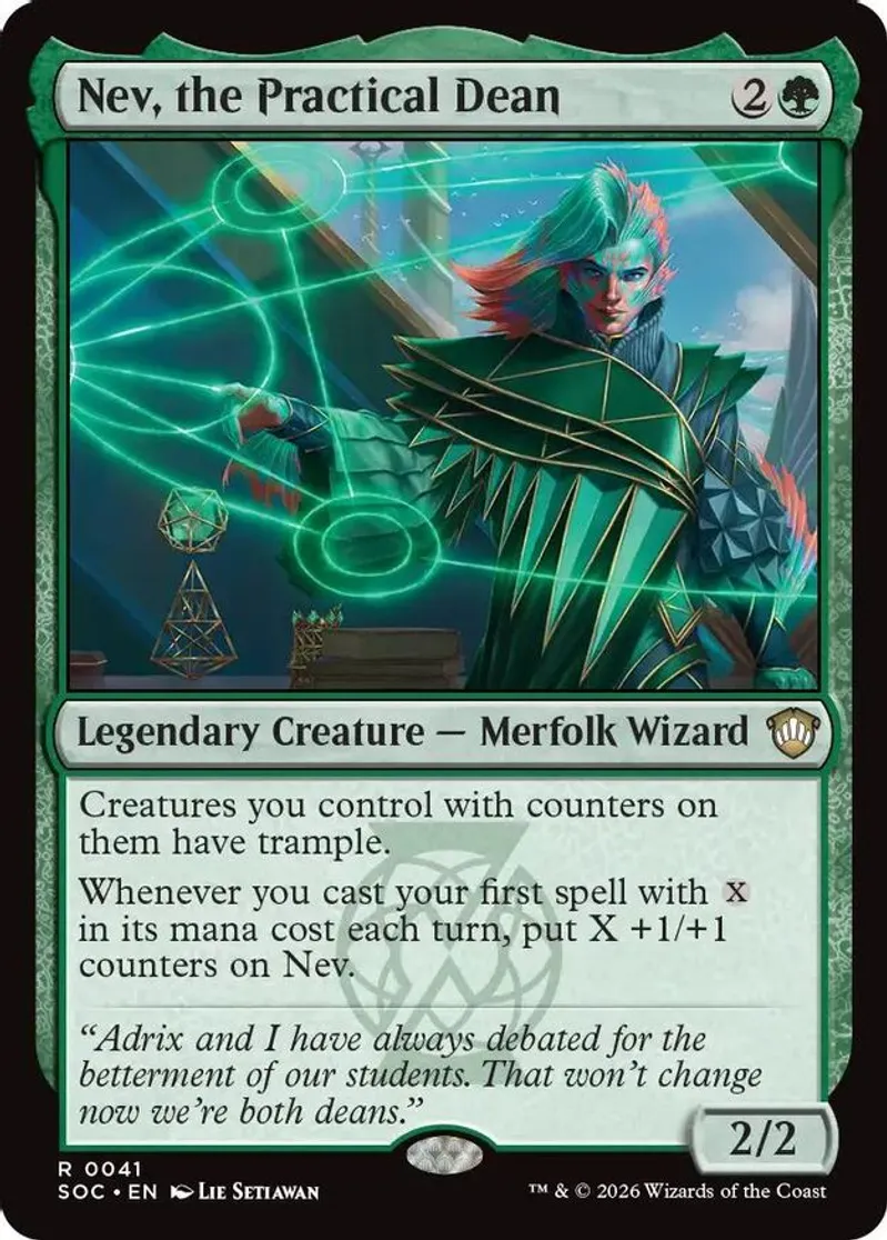 Magic: the Gathering (mtg) Rare legendary creature — merfolk wizard Nev, the Practical Dean from Commander: Secrets of Strixhaven (SOC) last updated 2026-04-17 00:18:40