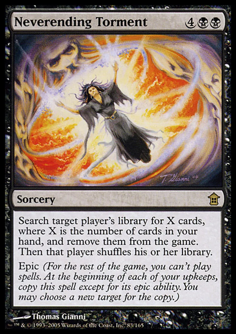 | Oracle Text | Search target player's library for X cards, where X is the number of cards in your hand, and exile them. Then that player shuffles his or her library. Epic (For the rest of the game, you can't cast spells. At the beginning of each of your upkeeps, copy this spell except for its epic ability. You may choose a new target for the copy.) | ||