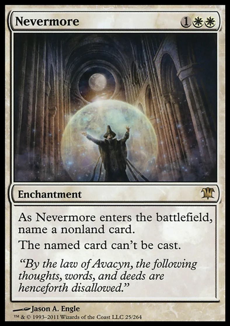| Oracle Text | As Nevermore enters the battlefield, name a nonland card. The named card can't be cast. | ||