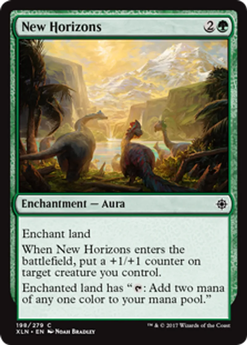 | Oracle Text | Enchant land When New Horizons enters the battlefield, put a +1/+1 counter on target creature you control. Enchanted land has "{{t}}: Add two mana of any one color to your mana pool." | ||