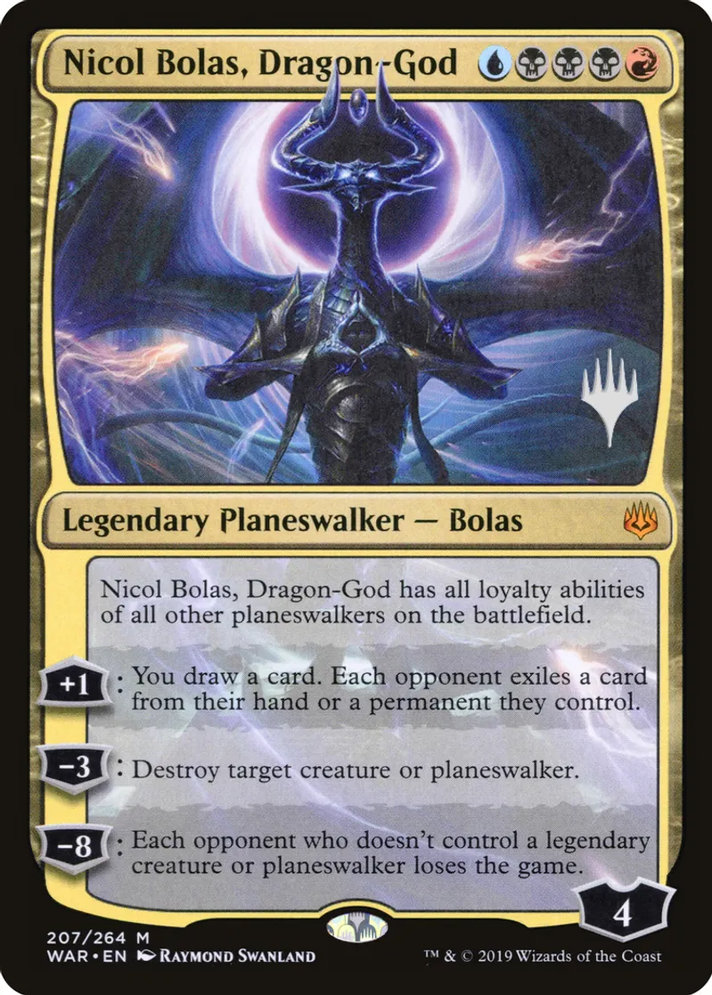 | Oracle Text | Nicol Bolas, Dragon-God has all loyalty abilities of all other planeswalkers on the battlefield.\r\n+1: You draw a card. Each opponent exiles a card from their hand or a permanent they control.\r\n−3: Destroy target creature or planeswalker.\r\n−8: Each opponent who doesn\'t control a legendary creature or planeswalker loses the game. | ||