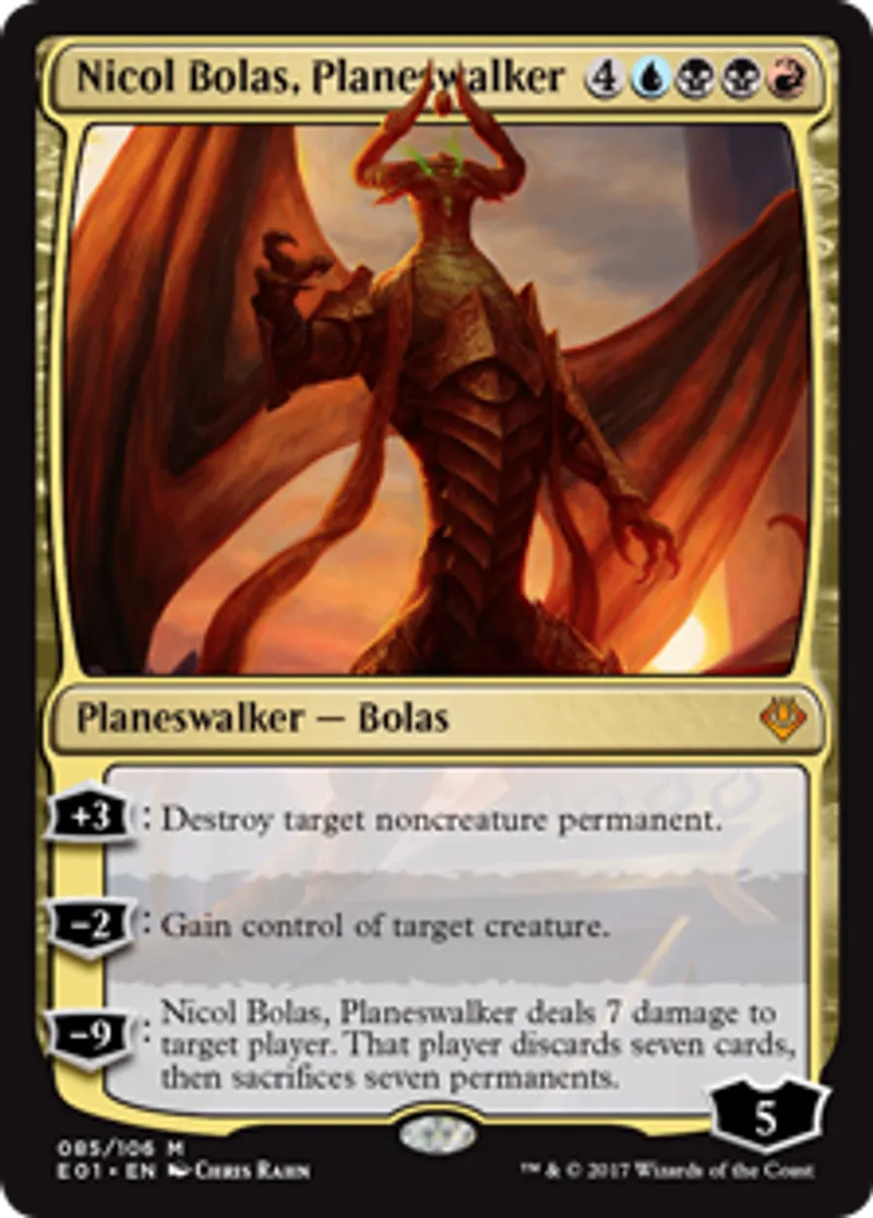 | Oracle Text | +3: Destroy target noncreature permanent. −2: Gain control of target creature. −9: Nicol Bolas, Planeswalker deals 7 damage to target player. That player discards seven cards, then sacrifices seven permanents. | ||