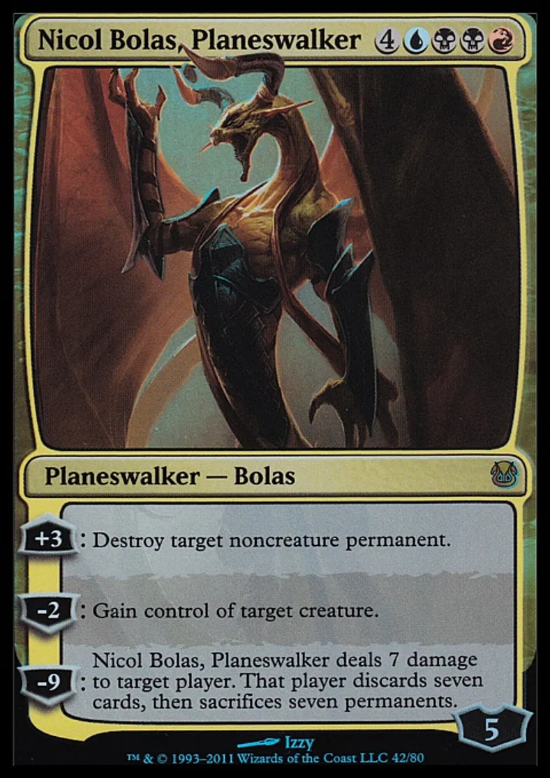 | Oracle Text | +3: Destroy target noncreature permanent. -2: Gain control of target creature. -9: Nicol Bolas, Planeswalker deals 7 damage to target player. That player discards seven cards, then sacrifices seven permanents. | ||
