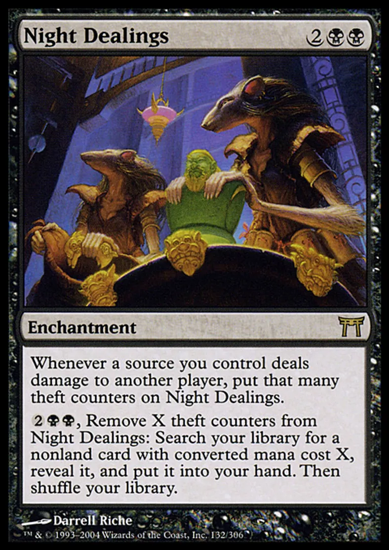 | Oracle Text | Whenever a source you control deals damage to another player, put that many theft counters on Night Dealings. {{2}}{{b}}{{b}}, Remove X theft counters from Night Dealings: Search your library for a nonland card with converted mana cost X, reveal it, and put it into your hand. Then shuffle your library. | ||