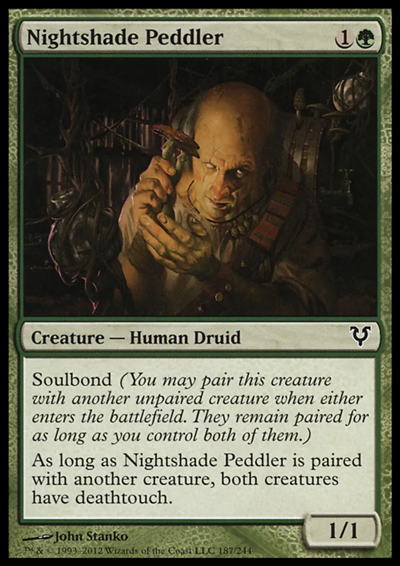 | Oracle Text | Soulbond (You may pair this creature with another unpaired creature when either enters the battlefield. They remain paired for as long as you control both of them.) As long as Nightshade Peddler is paired with another creature, both creatures have deathtouch. | ||