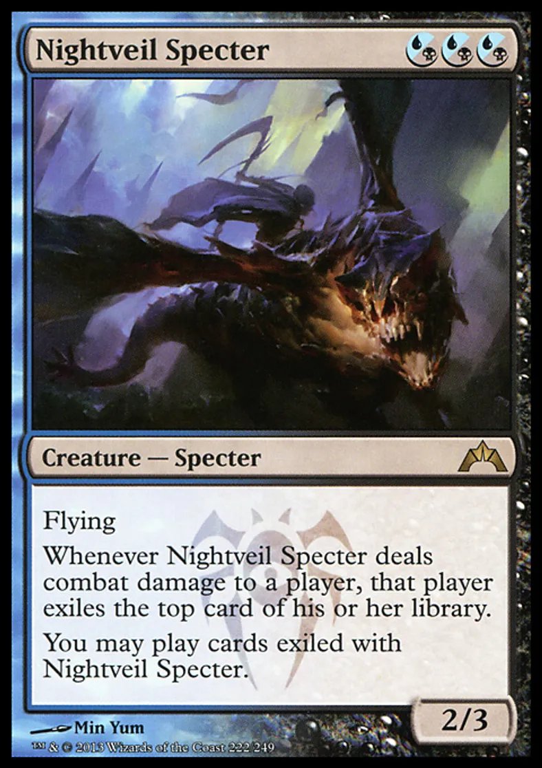 | Oracle Text | Flying Whenever Nightveil Specter deals combat damage to a player, that player exiles the top card of his or her library. You may play cards exiled with Nightveil Specter. | ||