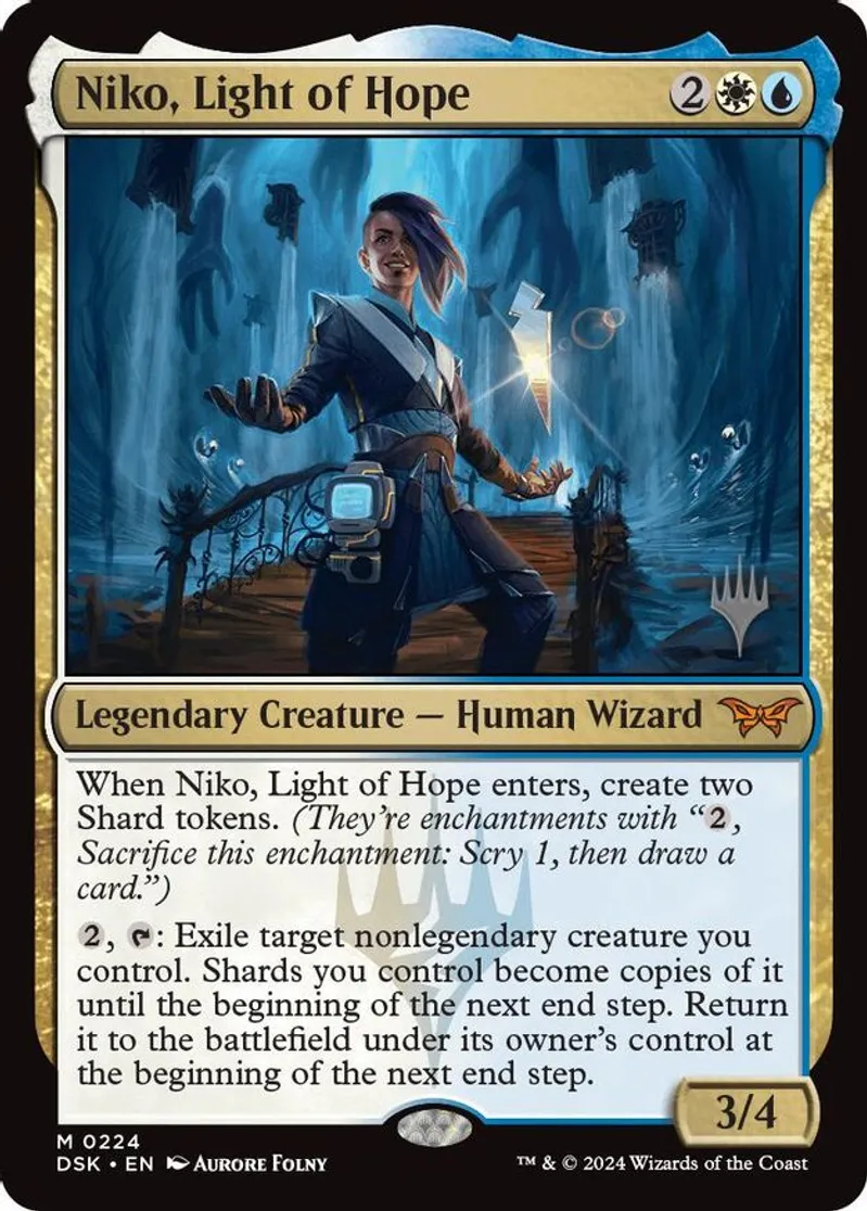 | Oracle Text | when niko, light of hope enters, create two shard tokens. (they're enchantments with "2 sacrifice this enchantment: scry 1, then draw a card") 2, t: exile target nonlegendary creature you control. shards you control become copies of it until the beginning of the next end step. return it to the battlefield under its owner's control at the beginning of the next end step. | ||