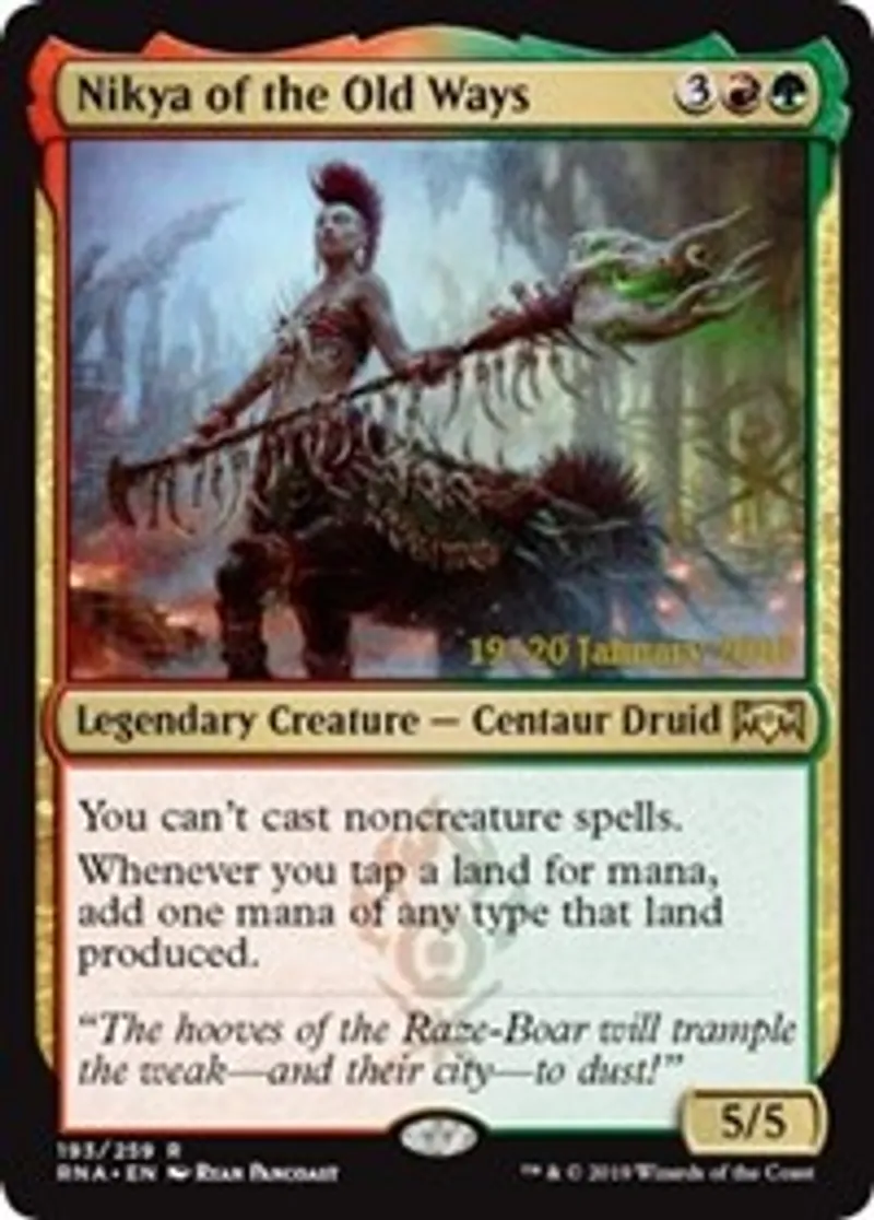 Magic: the Gathering (mtg) Rare Legendary Creature — Centaur Druid Nikya of the Old Ways from Prerelease Cards (pPRE) last updated 2026-02-21 16:56:32
