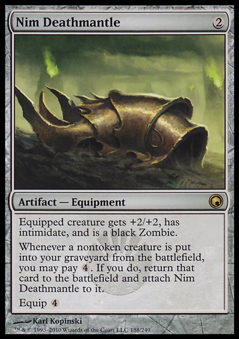 | Oracle Text | Equipped creature gets +2/+2, has intimidate, and is a black Zombie. Whenever a nontoken creature is put into your graveyard from the battlefield, you may pay {{4}}. If you do, return that card to the battlefield and attach Nim Deathmantle to it. Equip {{4}} | ||