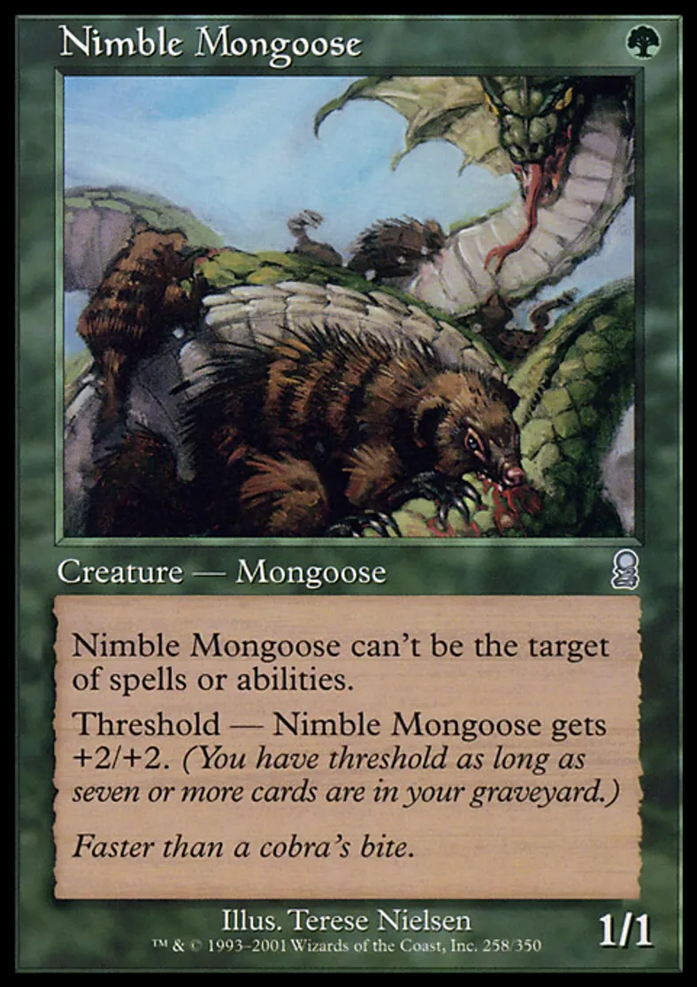 | Oracle Text | Shroud (This permanent can't be the target of spells or abilities.) Threshold — Nimble Mongoose gets +2/+2 as long as seven or more cards are in your graveyard. | ||