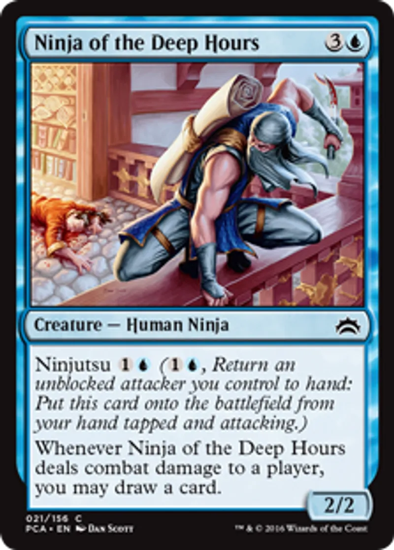 | Oracle Text | Ninjutsu {{1}}{{u}} ({{1}}{{u}}, Return an unblocked attacker you control to hand: Put this card onto the battlefield from your hand tapped and attacking.) Whenever Ninja of the Deep Hours deals combat damage to a player, you may draw a card. | ||