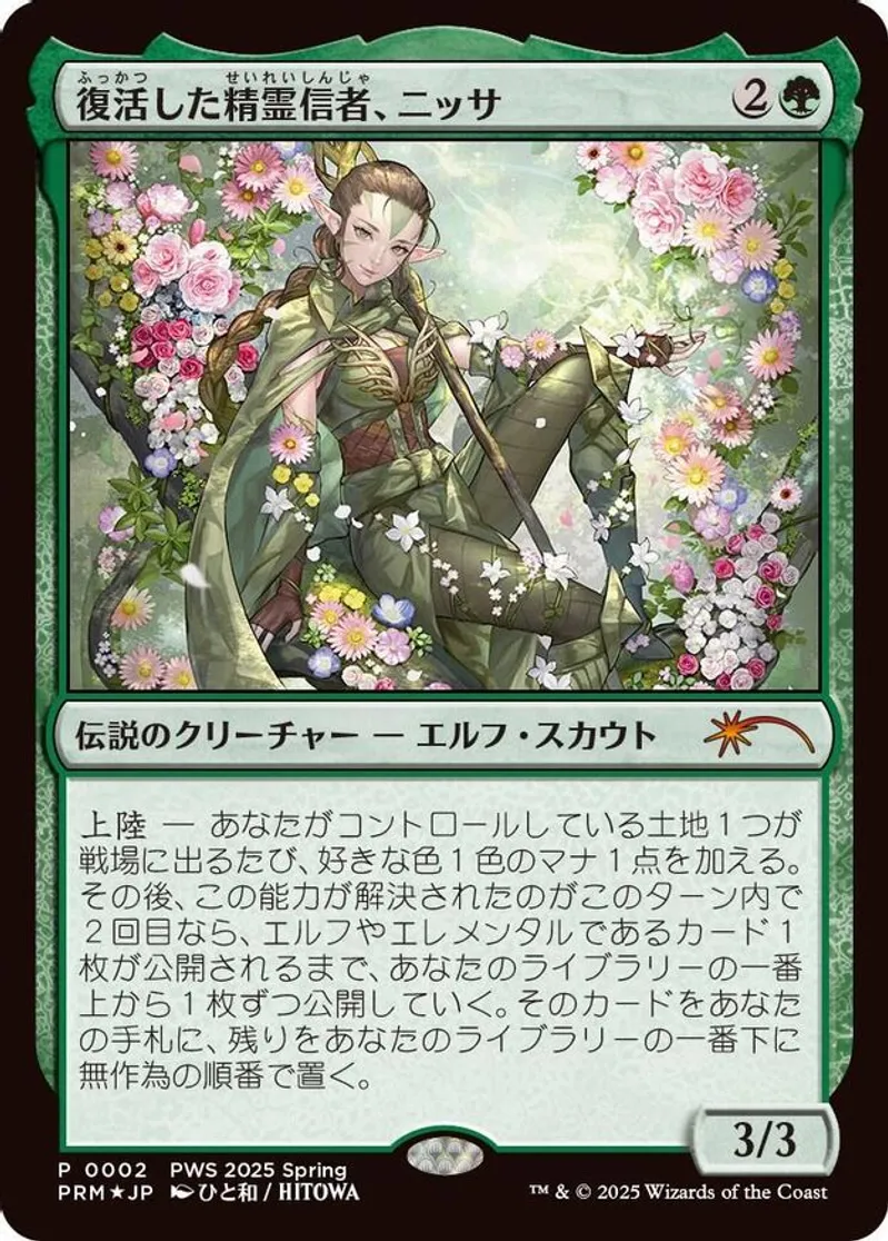 Magic: the Gathering (mtg) Promo legendary creature — elf scout Nissa, Resurgent Animist from Planeswalker Event Promos (PEP) last updated 2026-02-25 14:22:32