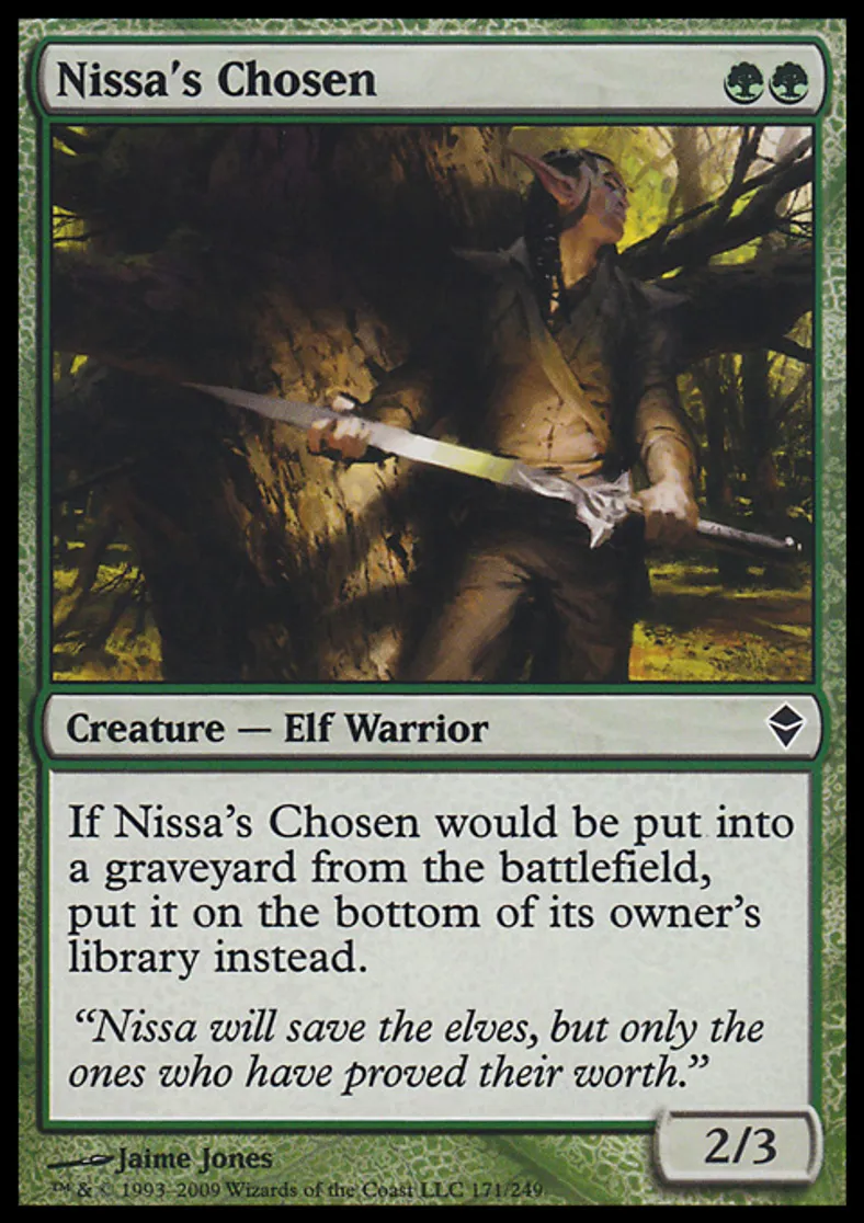 | Oracle Text | If Nissa's Chosen would die, put it on the bottom of its owner's library instead. | ||