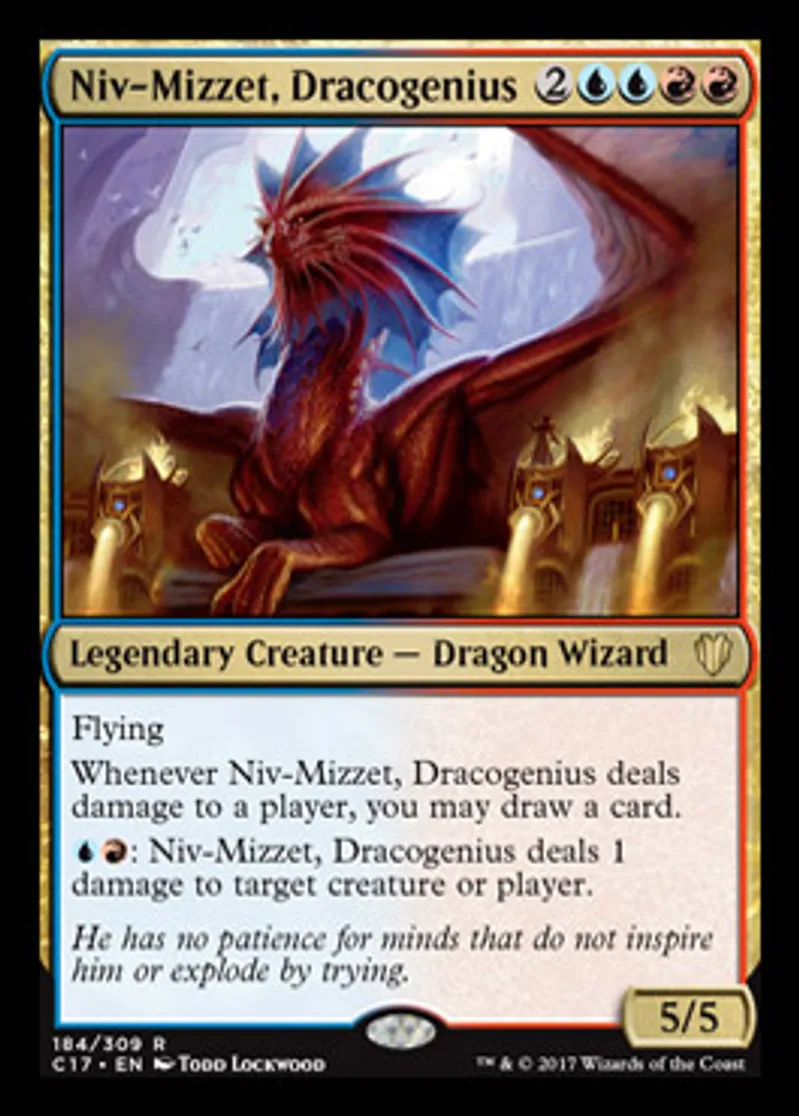 | Oracle Text | Flying Whenever Niv-Mizzet, Dracogenius deals damage to a player, you may draw a card. {{u}}{{r}}: Niv-Mizzet, Dracogenius deals 1 damage to target creature or player. | ||