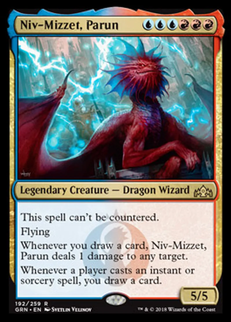 | Oracle Text | This spell can't be countered. Flying Whenever you draw a card, Niv-Mizzet, Parun deals 1 damage to any target. Whenever a player casts an instant or sorcery spell, you draw a card. | ||
