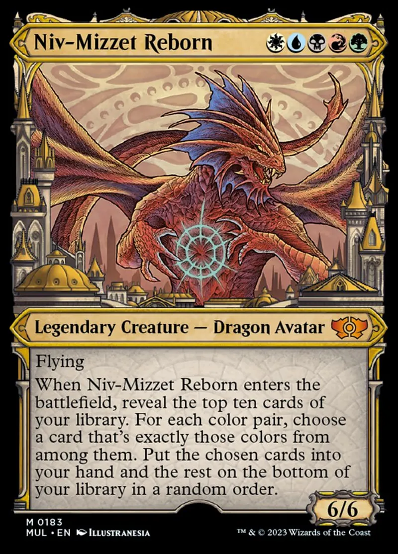 When Niv-Mizzet Reborn enters the battlefield, reveal the top ten cards of your library. For each color pair, choose a card that’s exactly those colors from among them. Put the chosen cards into your hand and the rest on the bottom of your library in a random order. | ||