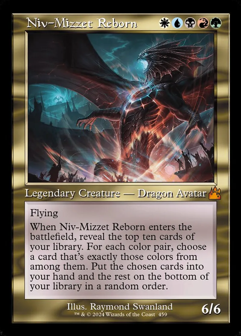 When Niv-Mizzet Reborn enters the battlefield, reveal the top ten cards of your library. For each color pair, choose a card that's exactly those colors from among them. Put the chosen cards into your hand and the rest on the bottom of your library in a random order. | ||