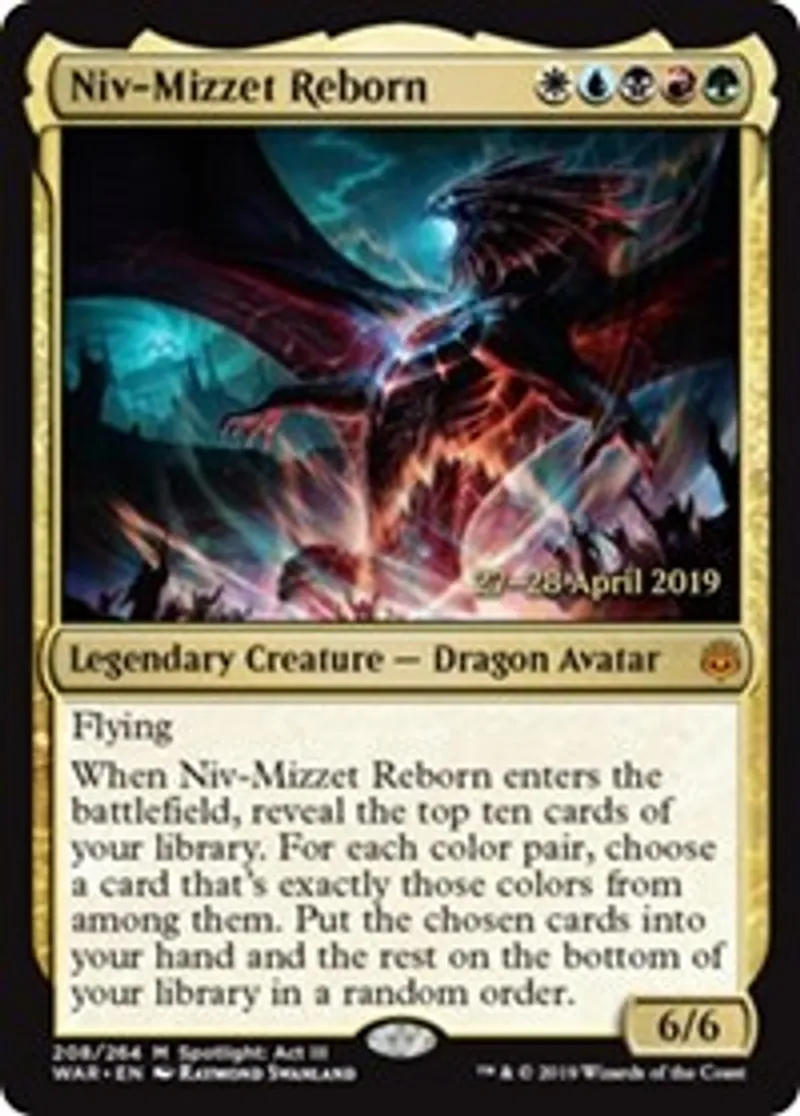 When Niv-Mizzet Reborn enters the battlefield, reveal the top ten cards of your library. For each color pair, choose a card that's exactly those colors from among them. Put the chosen cards into your hand and the rest on the bottom of your library in a random order. | ||