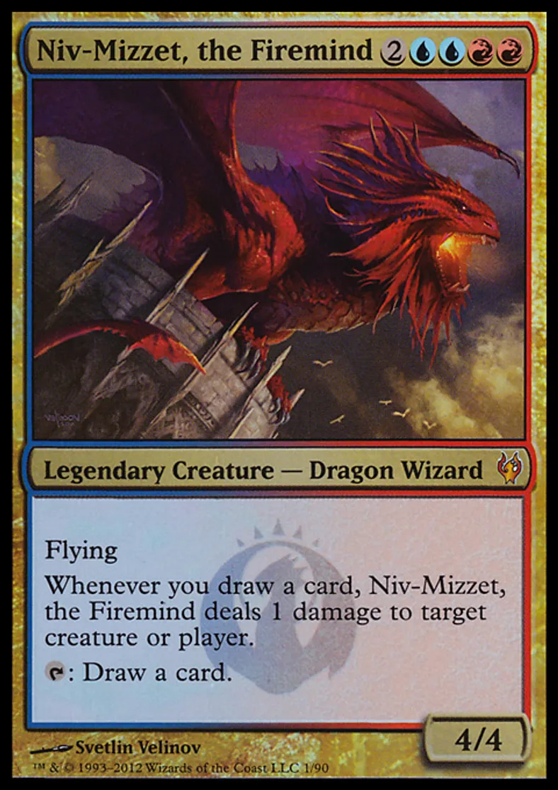 | Oracle Text | Flying Whenever you draw a card, Niv-Mizzet, the Firemind deals 1 damage to target creature or player. {{t}}: Draw a card. | ||