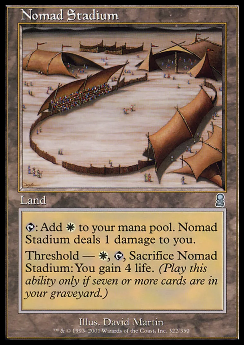 | Oracle Text | {{t}}: Add {{w}} to your mana pool. Nomad Stadium deals 1 damage to you. Threshold — {{w}}, {{t}}, Sacrifice Nomad Stadium: You gain 4 life. Activate this ability only if seven or more cards are in your graveyard. | ||