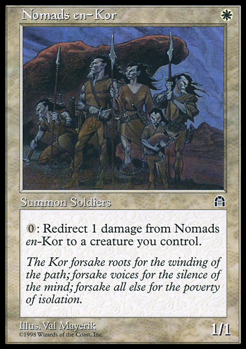 | Oracle Text | {{0}}: The next 1 damage that would be dealt to Nomads en-Kor this turn is dealt to target creature you control instead. | ||