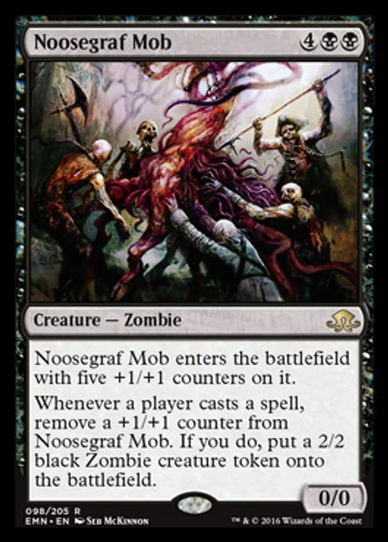 Whenever a player casts a spell, remove +1/+1 counter from Noosegraf Mob. If you do, put a 2/2 black Zombie creature token onto the battlefield. | ||