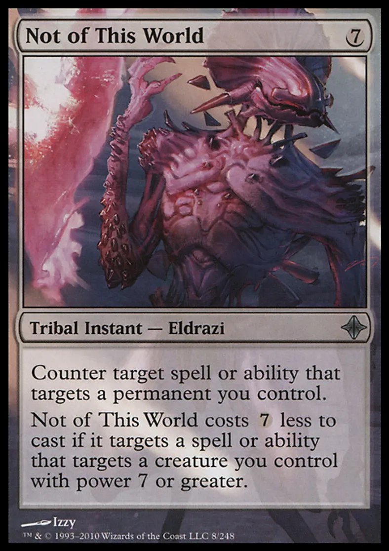 | Oracle Text | Counter target spell or ability that targets a permanent you control. Not of This World costs {{7}} less to cast if it targets a spell or ability that targets a creature you control with power 7 or greater. | ||