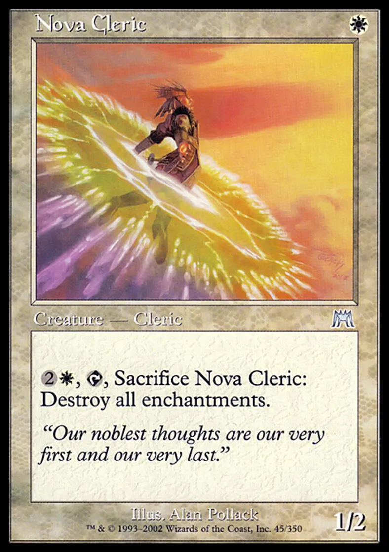 | Oracle Text | {{2}}{{w}}, {{t}}, Sacrifice Nova Cleric: Destroy all enchantments. | ||