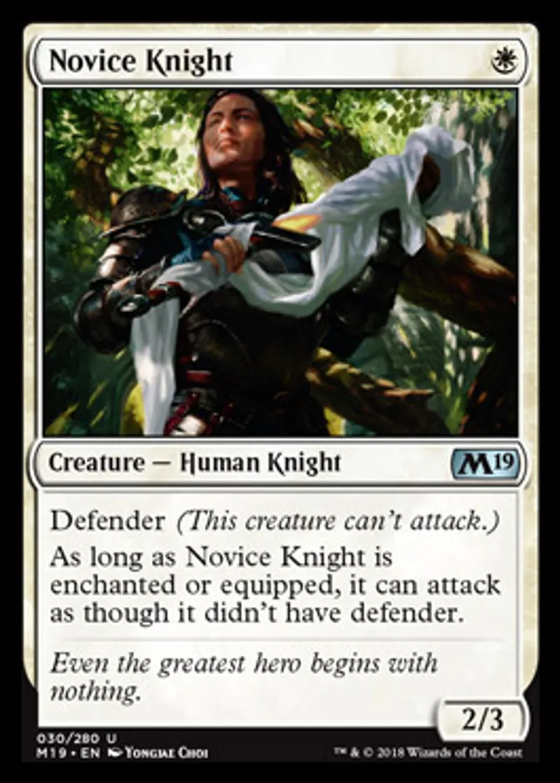 | Oracle Text | Defender (This creature can't attack.) As long as Novice Knight is enchanted or equipped, it can attack as though it didn't have defender. | ||